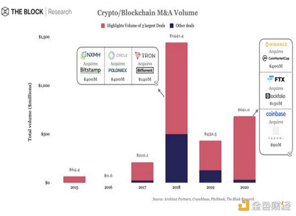 迄今為止,加密貨幣區塊鏈行業內部并購活動主要是合并現有行業參與者,只會牽涉到很少行業外的公司。