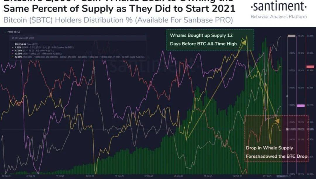 多年來,持有大量比特幣的“巨鯨”在BTC的增長中發揮了關鍵作用,2021年在價格升值問題上強調了它們的重要性。根據Santiment公司提供的數據表明,持有超過1000枚比特幣的大型持有者們擁有了約占總供應量的42.56%的比特幣。?