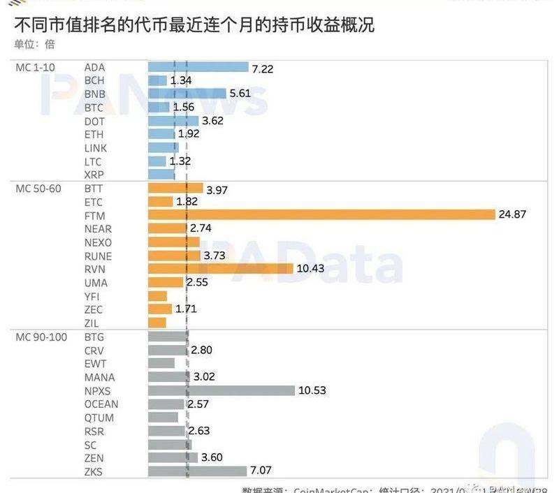PAData還統計了其他數字貨幣今年以來的持幣收益,結果顯示,抽樣的30種數字貨幣今年以來的平均持幣收益約為2.74倍,其中市值排名90-100的數字貨幣今年以來的平均持幣收益最高,約為2.81倍,市值排名1-10位的數字貨幣今年以來的平均持幣收益最低,僅約為1.92倍。在不考慮時間效率的情況下,除了收益最高的FTM以外,其他抽樣代幣的持幣收益都低于IDO收益。