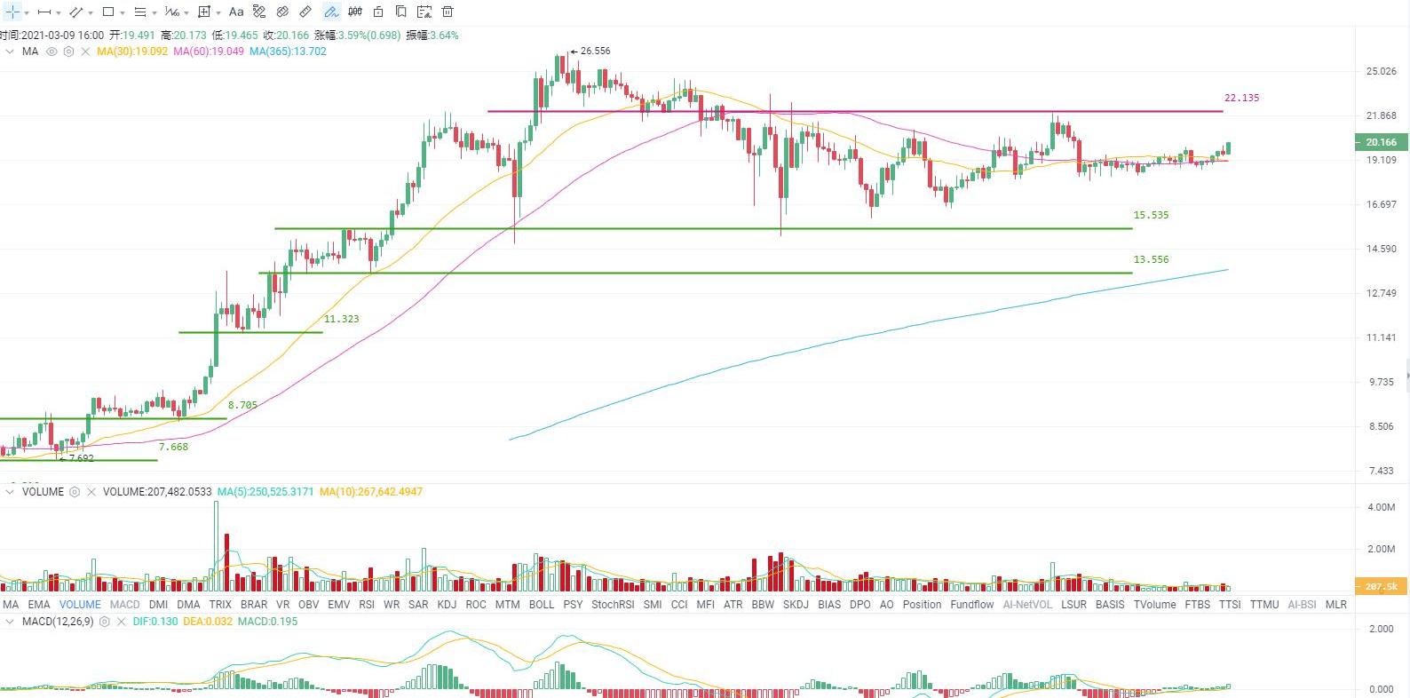 ATOM目前出現了脫離近期窄幅盤整期的跡象,截止發稿前幣價已經來到了20.2一線,創出自3月5日盤整以來新高。這主要是受到了比特幣今日的持續反彈所影響,從力度來看顯然明顯弱于比特幣。脫離最近4天的盤整后還要關注下一個潛在的盤整區間,其中盤整區間上沿在22一線。