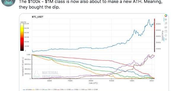 在推特上,MaterialIndicators在一張圖表上評論道:“10萬美元至100萬美元的訂單現在也將創建一個新的ATH。”