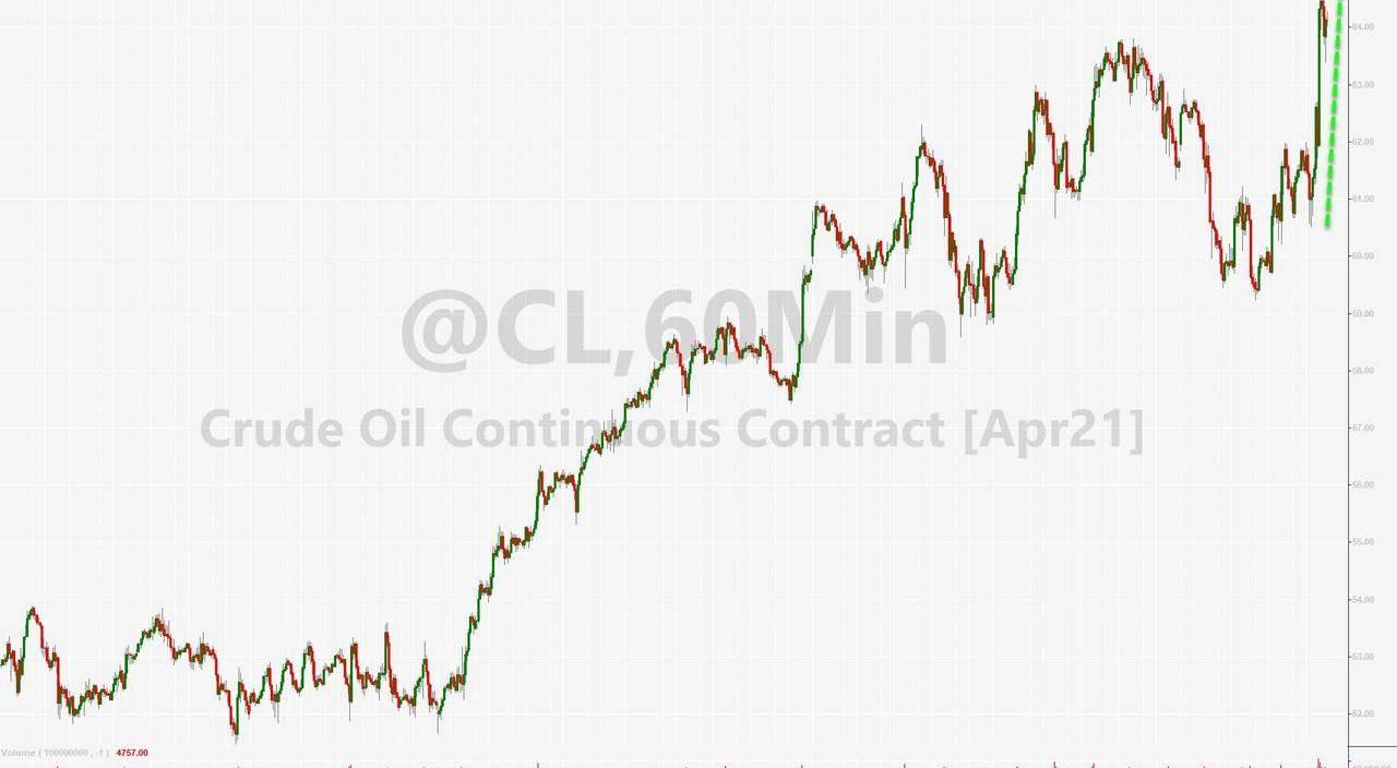 最終,WTI4月原油期貨收漲2.55美元,漲幅4.16%,報63.83美元/桶,創2019年4月30日以來即月合約收盤新高,并創今年1月5日以來最大收盤漲幅。布倫特5月原油期貨收漲2.67美元,漲幅4.17%,報66.74美元/桶,創去年2月25日以來即月合約收盤新高,和美油一樣創今年1月5日以來最大漲幅。