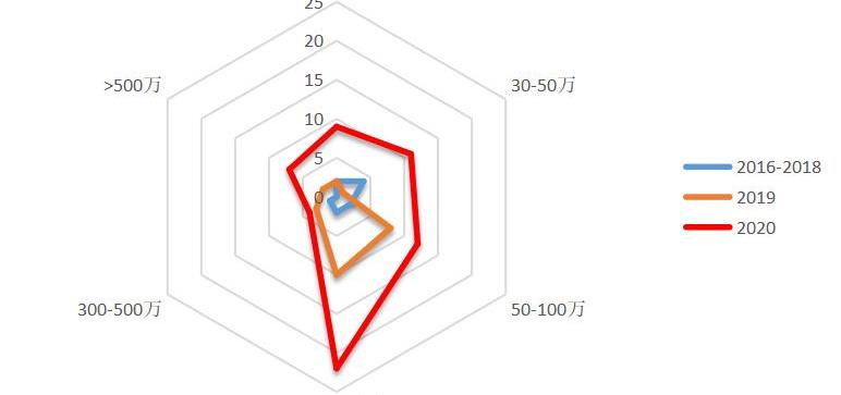 從中標金額來看,2016-2018年區塊鏈項目中標金額整體較低,大部分都是50萬元以內,處在初步發展期,以單一功能系統建設為主;2019年,50-300萬的項目逐漸增多,50萬以內的項目相較2016-2018年有所減少,政府開始規劃一些綜合性項目;2020年各類項目數均有所提升,并出現了多個千萬級項目,從小型業務區塊鏈系統的搭建到大型區塊鏈底層基礎設施的建設,全面鋪開、多點開花。