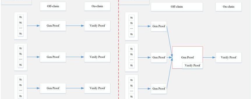 在Rollup方案里,一個很明顯的技術特點就是交易的批量處理,即對區塊里的所有交易的有效性產生一個證明,然后鏈上主合約完成證明的有效性驗證。如圖2左側所示,這和原始的單個交易處理力度相比,已經有了巨大的吞吐率的提升和交易成本的降低。然而,ZKSwap團隊發現,受限于零知識證明算法橢圓曲線參數的選取,一個區塊內能批量處理的交易數量是有限的,再加上鏈上一次驗證計算的成本高達50WGas,導致每筆交易的成本并沒有低到預期。因此,ZKSwap技術團隊持續進行技術應用創新的突破,并最終關注到了聚合證明方案。