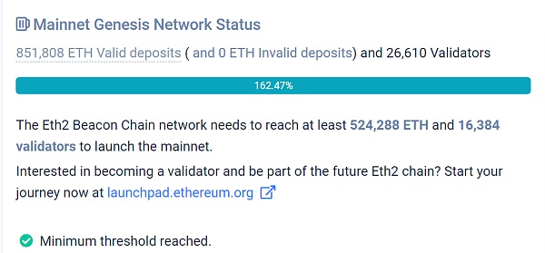 直到 11 月 24 日,用戶必須向該儲蓄合約中總計存入 524288 個以太幣(最低參與門檻為 32 個以太幣)。啟動 ETH 2.0 第零階段的另一個條件,是至少吸引到 16384 位驗證者的參加。