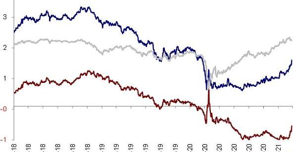 實際的通脹走勢與名義利率扣除TIPs實際利率隱含的通脹預期經常會被混淆。我們預計利率上行主要以實際利率為主,主要是考慮到:a)隱含的真實增長和投資回報率回升;b)長端通脹預期接近長期區間上沿2.2~2.5%,提前反應了未來通脹走高的預期;c)短端和長端的通脹預期已然倒掛,表明短期債券計入了更多通脹走高的預期,而這一倒掛從歷史經驗來看也不能持久。