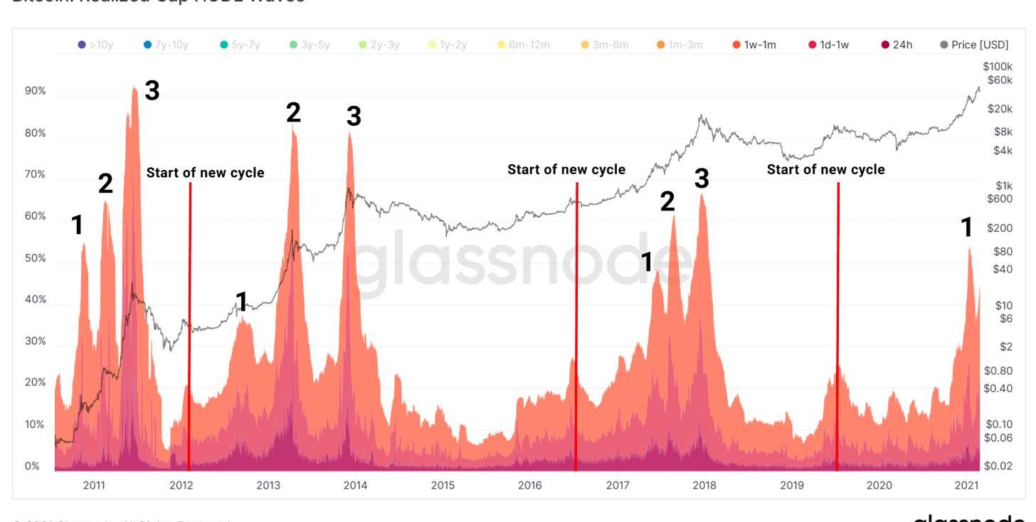 正如我們在“RC-HODL曲線”中所看到的那樣,短期比特幣持有者在之前牛市頂部區間占據了主導地位。宏觀上看,只要1個月或更短的比特幣持有者開始占總數的60%以上,我們就接近周期中的頂部區間了。