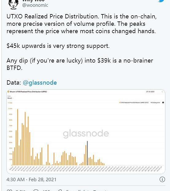 WillyWoo用實現價格分布展示了潛在的鏈上價格底線可能存在的地方。這個指標計算了不同價格水平下鏈上交易量。目的是找到在鏈上積累了大量交易量的價格水平,從而更有可能獲得支撐。利用這一指標,Willy將4.5萬美元區域確定為潛在的支撐位。