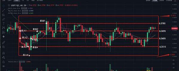 舉個例子:在2月4日到2月7日之間,中幣平臺上的USDT/QC交易對的價格一直在6.3425元-6.3875元之間來回震蕩。這種行情即為震蕩市,而且由于這兩個幣種都是穩定幣,發生單邊行情的概率非常低,適合采用網格交易。