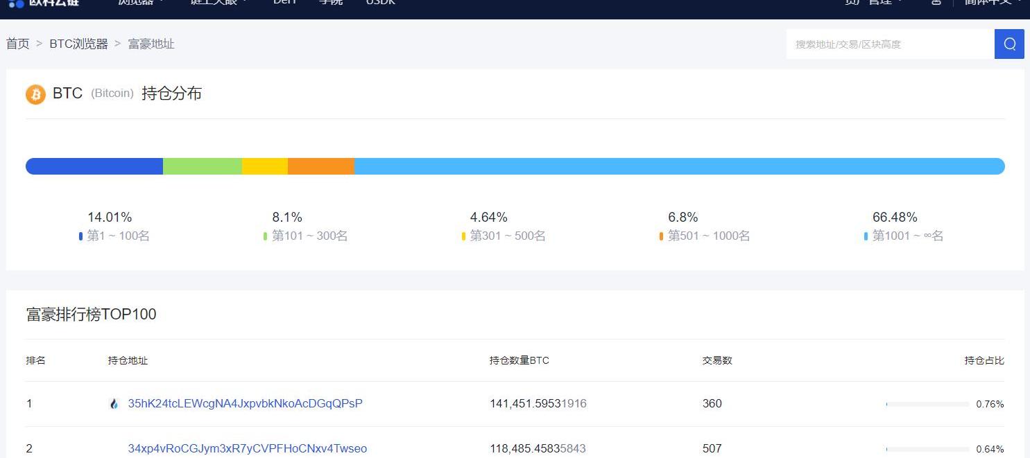 與此同時,在排名前1000位的比特幣頭部地址中,前十名的地址持倉數量為91.58萬BTC,環比下降2484枚;占當前比特幣供應量的4.95%;而持倉前一千名的比特幣地址當前則共計持有634.14萬BTC,環比增長9.63萬枚,占當前比特幣流通量的34.02%,環比上升0.57%。