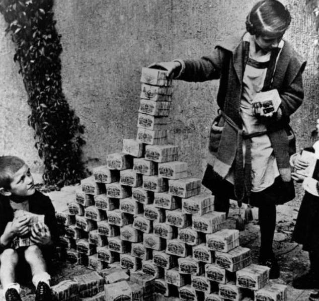 德國通脹危機后孩子把成沓的紙幣當玩具