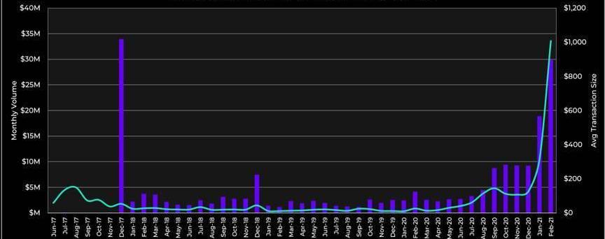 在基礎網絡層面上,我們同樣看到空前的交易量。2017年末。「加密貓」CryptoKitties狂潮頂峰時期,24小時內交易額一度達到200萬美元以上。但在上周末的情人節那天,僅Layer1上的NFT交易額就超過了600萬美元。