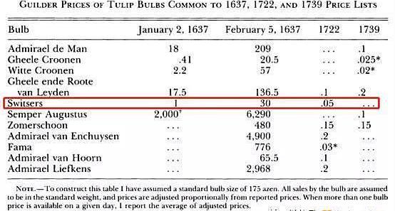 郁金香漲幅最高的是,一款名叫Switsers的郁金香,其在崩盤之前,價格漲了30倍。