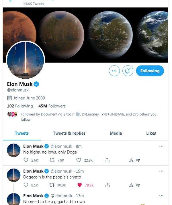 2021年1月29日,埃隆·馬斯克推特主頁簡介部分變為Bitcoin。同時,埃隆·馬斯克還表示,“回想起來,這是不可避免的”。
