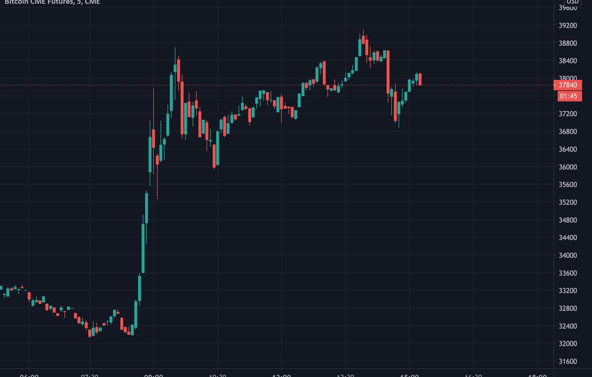 從圖表上可以看出,CME的合約價格上漲了約500美元,溢價為1.3%。值得注意的是,TradingView將CME的數據延遲了10分鐘,這意味著CME價格圖表必須與Bitstamp上之前的K線進行比較。
