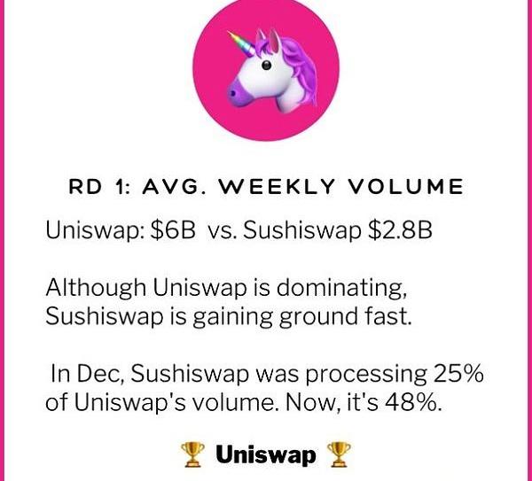 就在一個月前的12月,Sushiswap平均處理的交易量是Uniswap每周交易量的25%。現在,該協議的平均處理量達到了Uniswap交易量的48%。