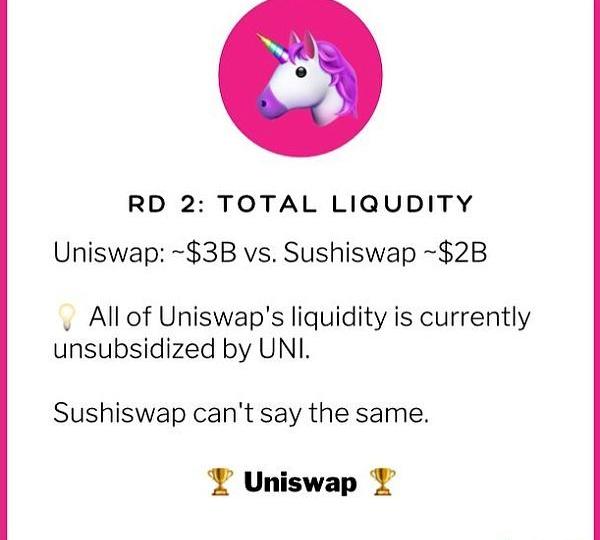 幾個月后,情況漸趨平穩。Uniswap和Sushiswap如今都擁有數十億美元的流動性。不過,也有個關鍵的區別。