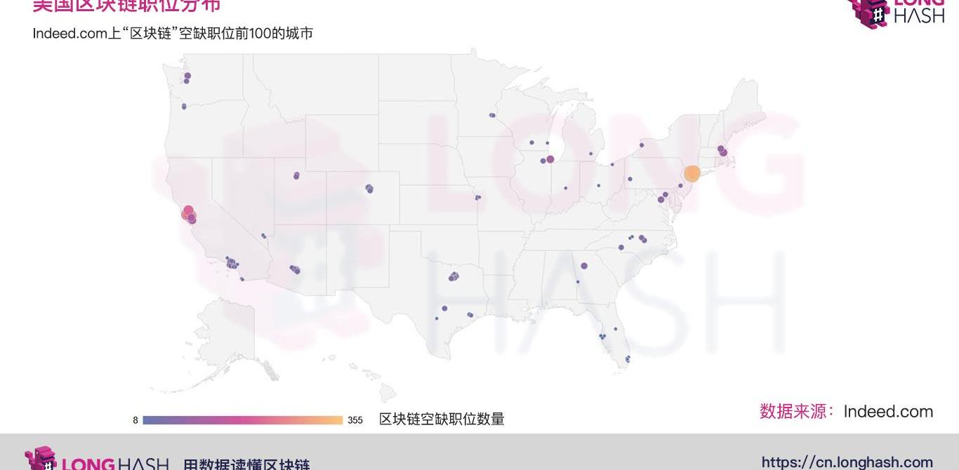 例如,雖然灣區顯然是加州地區的區塊鏈之城,但在南加州也有一個相當大的區塊鏈就業市場在發展。德州的工作主要集中在休斯頓,但奧斯汀也有幾十個區塊鏈工作機會。