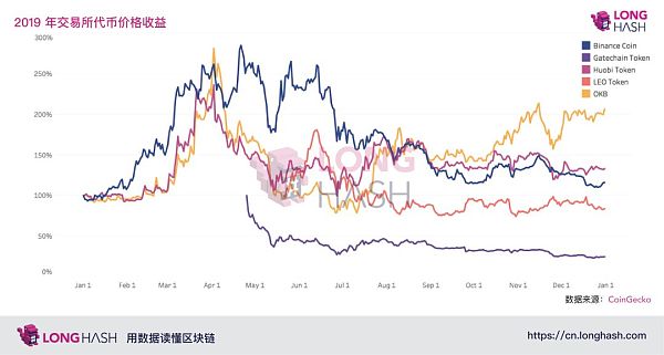我們發現,所有的交易所代幣在 2019 年第一季度的表現都尤其好,收益超過 100% ,但這種可觀的收益在 2019 年隨后的時間里消失了。到年底,表現最好的交易所代幣來自 OKEx ( 2 倍)和火幣( 1.3 倍)。幣安幣(BNB)在年中時曾創造了大幅收益,遺憾的是未能保持到年底。Gate.io 和 Bitfinex 的代幣在 2019 年雙雙一路走低。