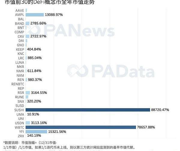 市值排名前30的DeFi概念幣的幣價平均上漲了191.33%。YFI和BAND是全年表現最好的兩個DeFi概念資產。