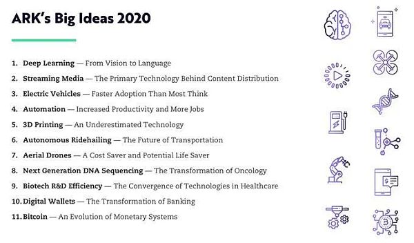 善于用社交媒體的木頭姐在推特上有28萬關注。她在推特上與公眾溝通互動,還和團隊一起公布了自己的投資思路。包括以下這個Big Ideas 2020,和五張細分的PPT。這是其團隊一貫的風格:研究極其透明,不怕你學,就怕你學不會。