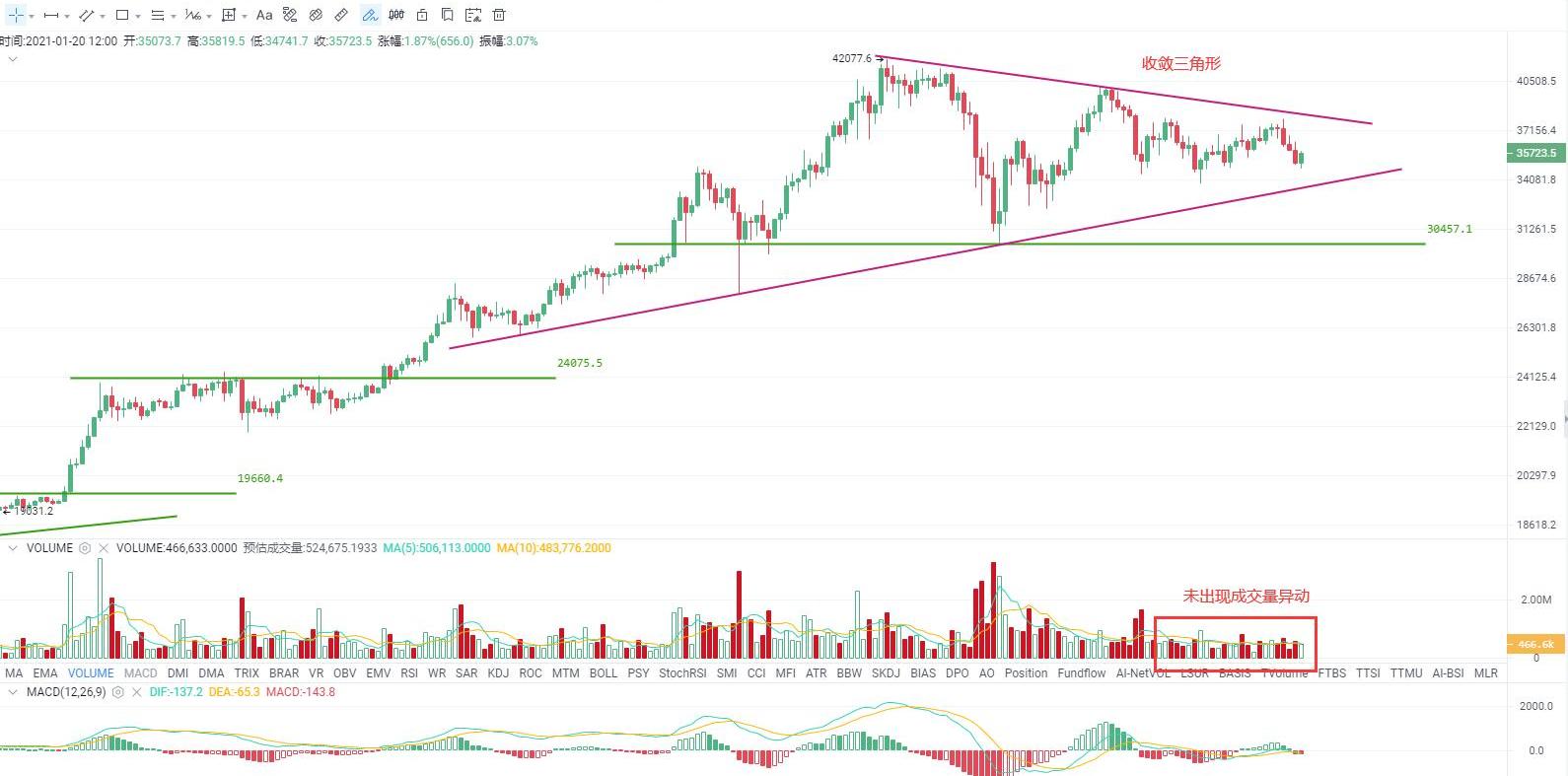 在今日凌晨時段,比特幣再次創出自1月17日以來的反彈新高,不過好景不長,再次延續了此前新高即調整的走勢特征,而且這次的回落幅度和持續時間都相對較長,但成交量并沒有發生明顯異動。從整體看,幣價依舊圍繞在高位收斂三角形形態中震蕩運行,方向不明。