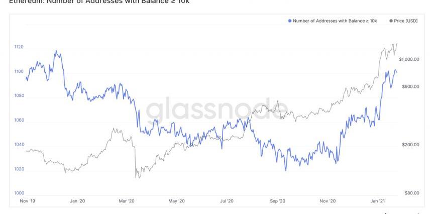 根據區塊鏈分析公司Glassnode的鏈上數據,上周六,鯨魚地址的數量(至少擁有1萬個ETH)躍升至1103個,創下13個月來的新高。僅在本月就新增了35,自11月中旬以來新增75。投資者積累的資金不斷增加,可能會推動以太坊價格進一步上漲。