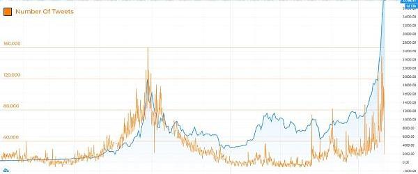 下圖顯示了過去5年每日推文數量與比特幣價格的對比圖。我們可以看到一個類似的趨勢,即Twitter的活躍度隨著比特幣價格的大幅波動而激增。