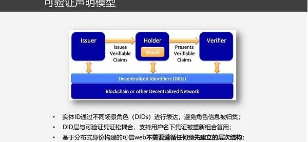 首先,身份各方將自己的身份在分布式賬本上進行公示,以提供后續身份交互過程中的數據驗證支持。第二,發行人向身份持有者簽發身份憑證,身份持有人接收驗證并保存憑證。第三,身份驗證方向持有人請求身份憑證信息,持有者簽名并出示可驗證憑證,身份驗證方驗證憑證的歸屬和憑證簽發來源。可驗證憑證流轉模型的主要特點或者說是主要優勢在于:一是支持實體ID通過不同場景下角色來進行表達,從而避免了角色信息被歸集。二是DID與可驗證憑證解耦,支持了用戶名下的憑證信息可以被重新組合復用。三是基于分布式身份構建的可信Web不需要遵循任何預先建立的層次結構。
