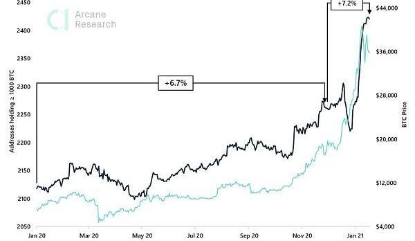 高凈值人士與機構投資者可謂是本輪加密市場牛市的主力軍。Glassnode的數據也從側面證實了這一點,研究機構ArcaneResearch近日引用Glassnode數據指出,持有100枚以上比特幣的地址數量也正急劇攀升。其中,自去年12月以來,持有至少1000枚比特幣的地址數量已增長了近7.2%。相比2020年,加密貨幣鯨魚數量增加了6.7%。