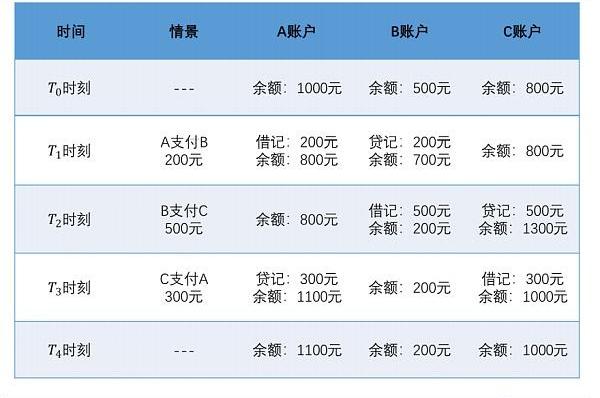 ?T0時刻,A的賬戶里有1000元,B的賬戶里有500元,C的賬戶里有800元。