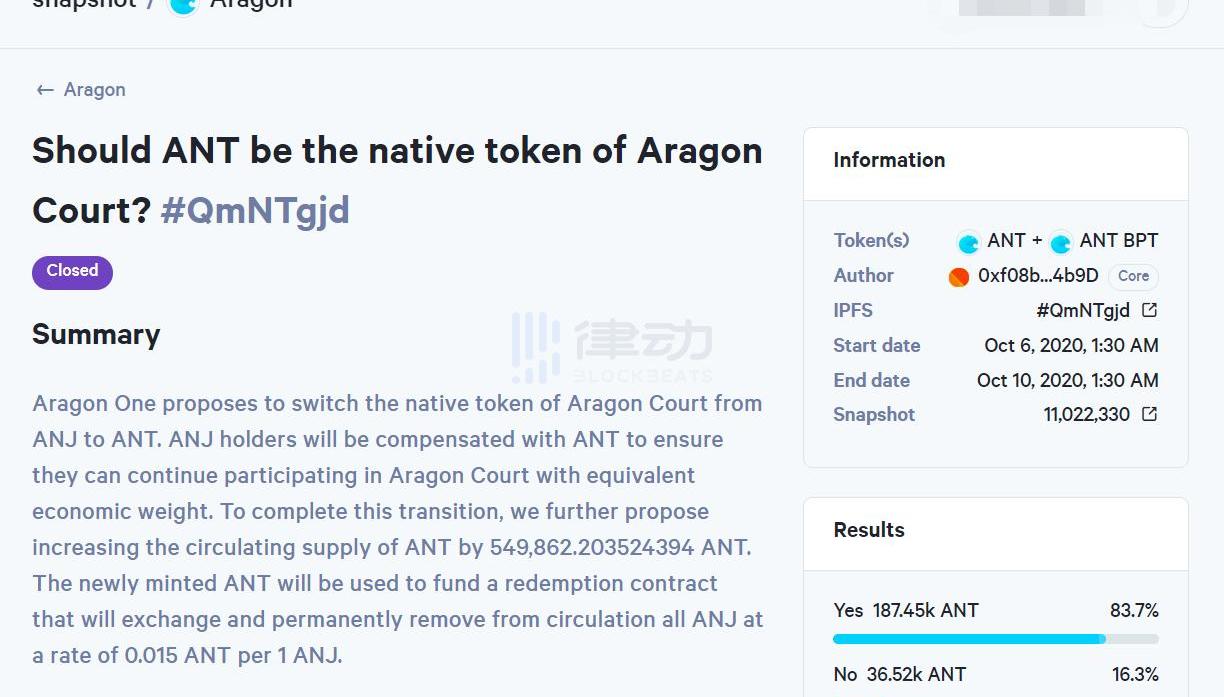 據了解,出于提高AragonCourt的使用率,以及減少系統中多個代幣的困惑,Aragon在去年提出了將ANJ/ANT進行合并的提案。2020年10月11日,Aragon社區發起的最新治理提案通過,原來代幣經濟系統中的ANJ合并回ANT,每1ANJ將兌換為0.015ANT,并取消ANJ代幣。