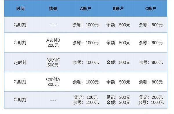 ?T0時刻,A的賬戶里有1000元,B的賬戶里有500元,C的賬戶里有800元。