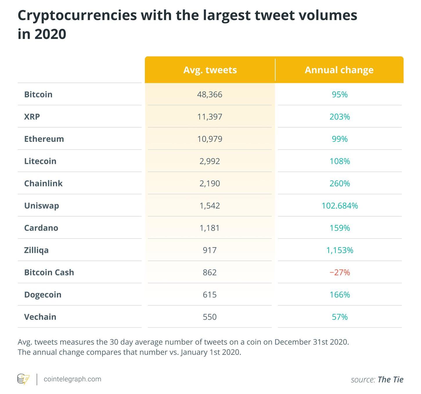 TheTie是一家提供基于社交媒體分析的加密公司,其聯合創始人兼首席執行官JoshuaFrank告訴Cointelegraph:“在市值最高的100種資產中,這些加密貨幣的平均推文量增長了87%,而比特幣的推文量飆升了95%。”