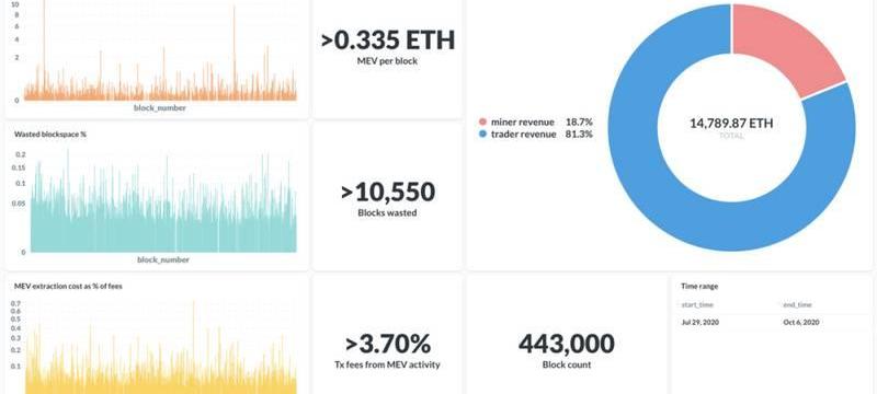 理解當前的MEV收集手段所帶來問題的第一步是量化它們的影響。此前也有一些網頁,例如frontrun.me27,和一些行業指標網站,收錄于MEV相關的指標,但我們發現需要有一個標準化和可延展的方法,來利用以太坊和其他區塊鏈所產生的此類數據。