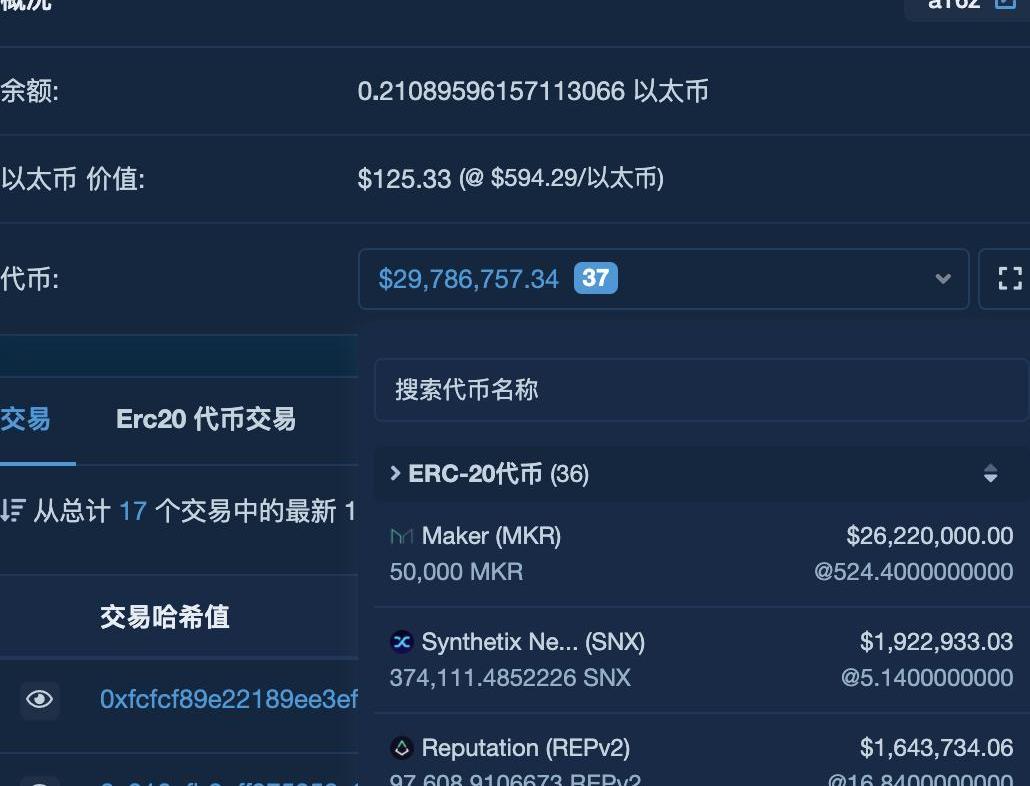 頂級投資機構a16z的錢包之一,該錢包地址也已經在Etherscan被標注為a16z。目前地址之中有5萬枚MakerDAO代幣MKR,價值約2850萬美元,37萬枚Synthetix代幣SNX,價值約190萬美元,9.7萬枚Augur代幣REPv2,價值約160萬美元。