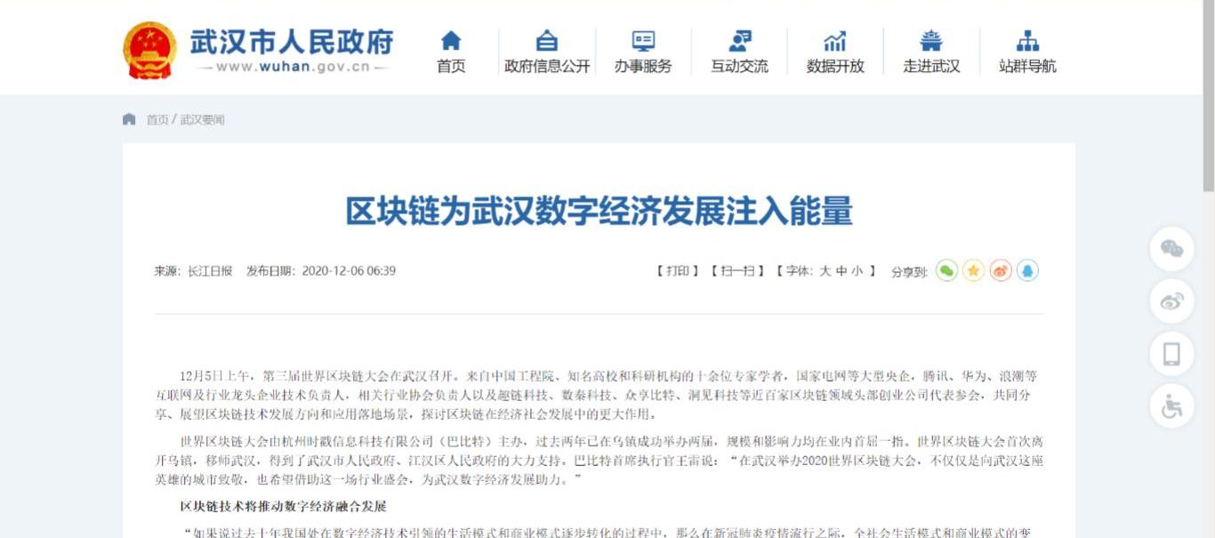 本次大會全網累計輸出稿件310篇、快訊339條,全網閱讀量超550萬人次。長江日報、長江網、第一財經、武漢廣播電視臺、楚天都市報等媒體均在第一時間對大會做了報道。其中,長江日報在12月6日第二版以“區塊鏈為武漢數字經濟發展注入能量”為題,對大會做了大篇幅報道,武漢市人民政府門戶網站轉載了該篇報道。