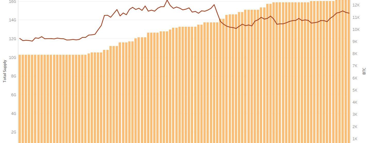 上圖為USDT在第三季度的流通供應量情況以及BTC的走勢,BTC走勢整體呈現一個“拱形”,可看出BTC在高位震蕩時,USDT流動供應量增幅相對較大;BTC在相對低位震蕩時,USDT流通供應量增幅較緩。從另一個角度來說,USDT流通供應量增量幅度和BTC價格呈現一種正相關關系。