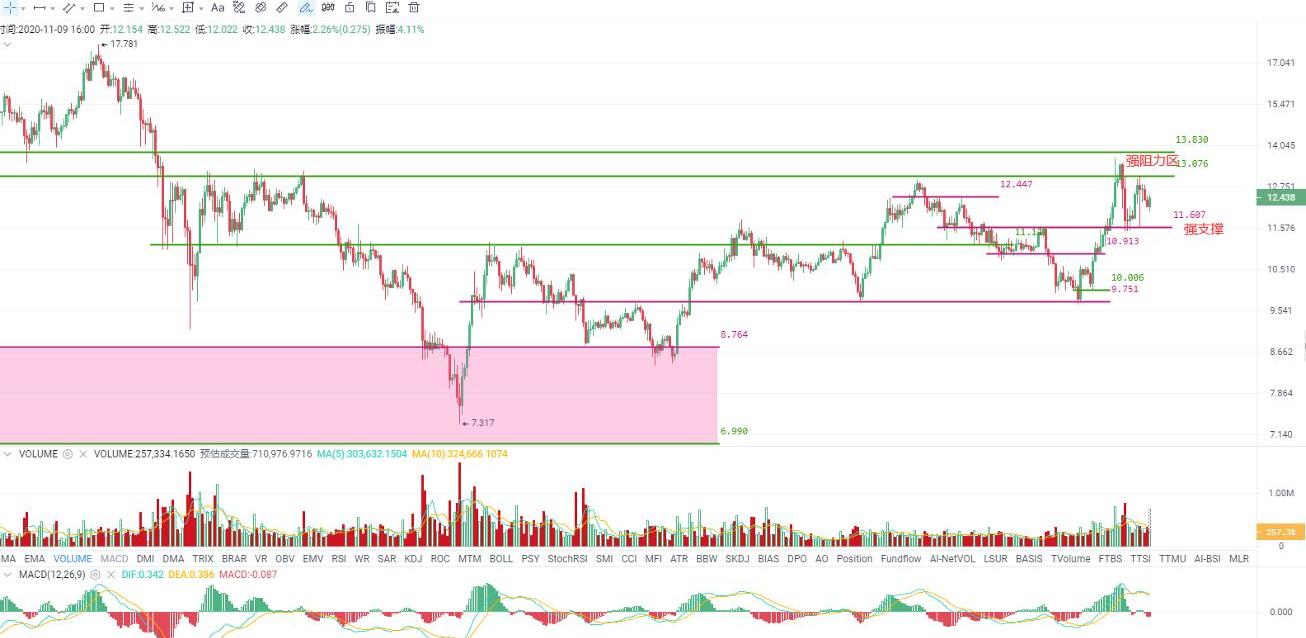 從走勢結構看,中短期走勢處于偏多格局,短期重要支撐在11.6一線,以當前市場整體情緒較高的狀態下,出現下破的概率不大,那么如果價格回落到該價位附近出現止跌跡象后就是較好的低吸買入機會。不過短期內難有大幅上漲出現了,13一線或是本周的強阻力。