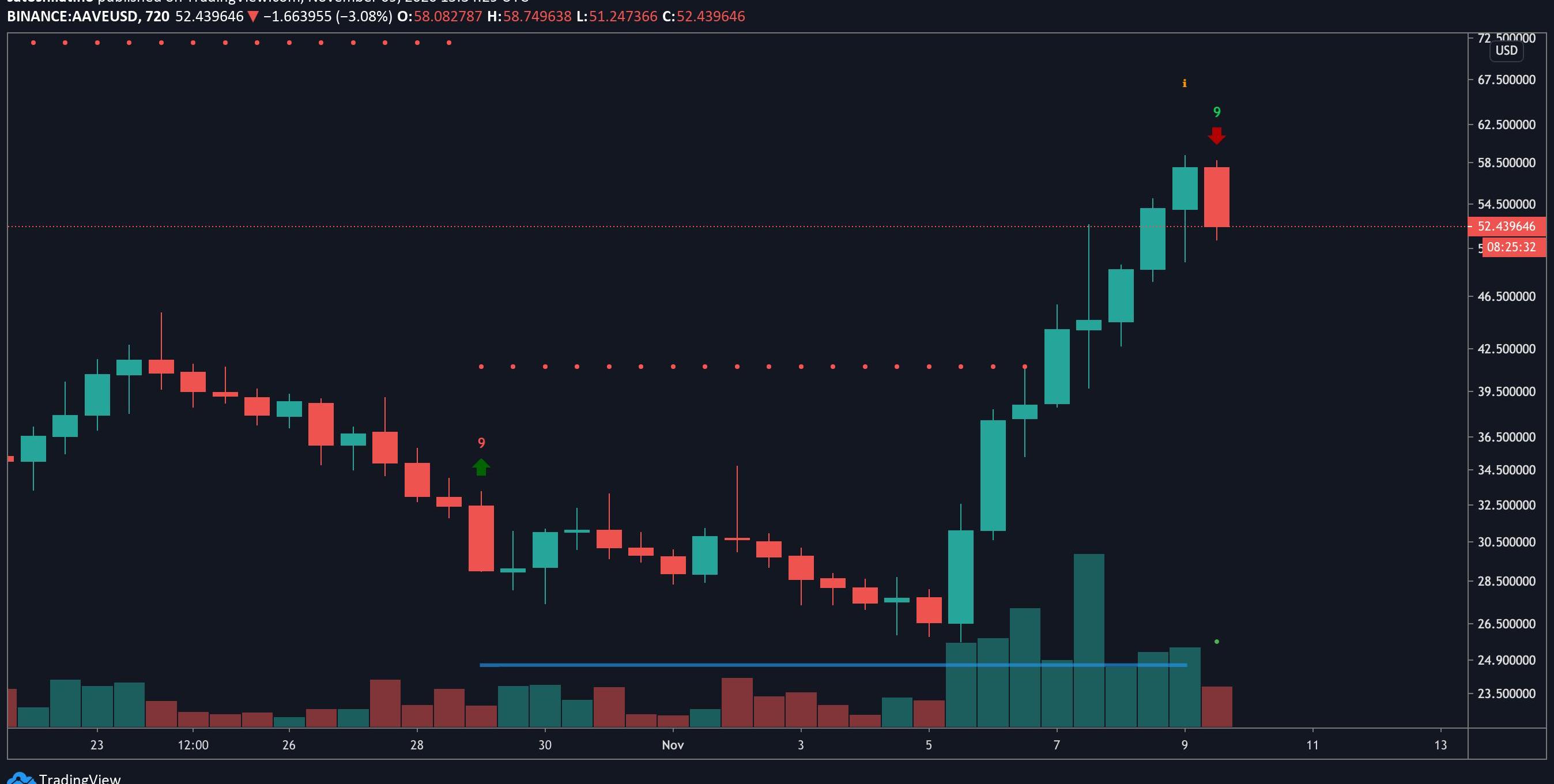 Aave在11月5日經歷了需求的大幅飆升,其價格飆升了120%以上。這個DeFi代幣在四天內從26.4美元的低位上漲至59美元的高位。盡管在如此短的時間內取得了巨大的收益,但價格可能準備回撤。