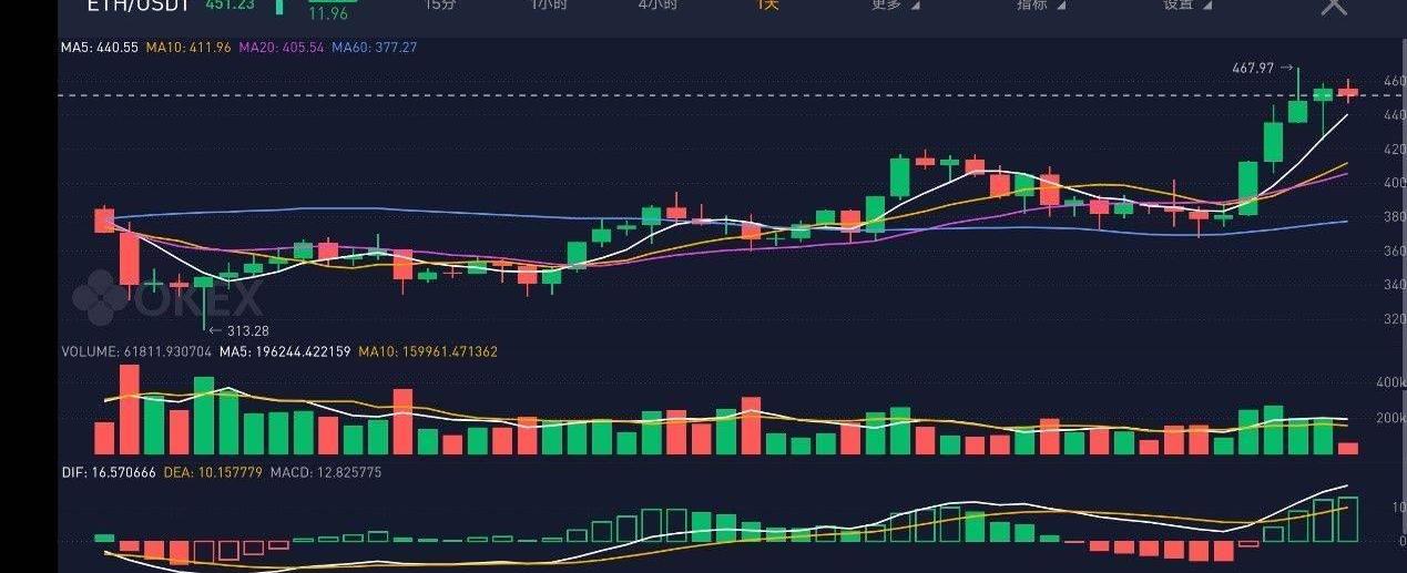 除此之外,最能反應用戶期待與關注的就是ETH代幣價格變化。據OKEx數據顯示,自11月4日晚間消息公布后,ETH大幅拉升,最高觸達467美元,之后企穩450美元。截至11月9日,漲幅較11月4日,最高達到24.8%。