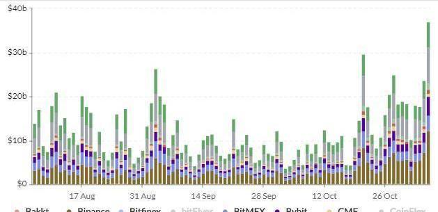 比特幣期貨市場交易熱度持續走強,過去一周成交量再增加近四成,達近1430億美元。其中,11月5日的單日交易量突破368億美元,是過去一周日均交易量的1.8倍。CME的交易量在連續兩周大漲后本周回落逾28%,一周交易量為25.92億美元。