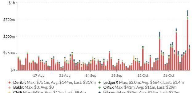 比特幣期權市場交易熱度激增,一周交易量突破27億美元,大增近五成,其中,11月5日達8.88億美元,創單日最高紀錄。另外,Deribit的交易量分別在10月30日和11月5日創下歷史新高,分別為5.53億美元、7.51億美元,交易量占比也升至84%左右。另一方面,CME交易量在上周反彈兩倍后,過去一周回落45%。