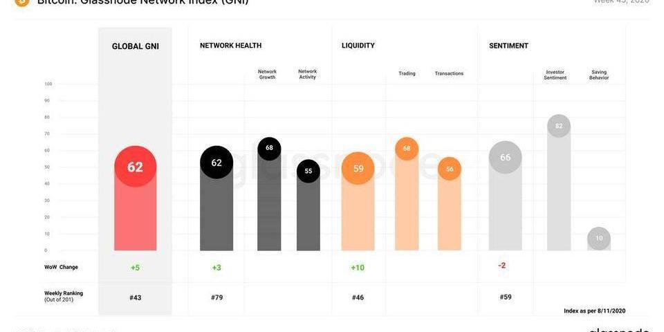 第45周,BTC鏈上基本面小幅上漲,開始彌補前一周的損失。GNI上漲了5點,達到62分。這一漲幅主要是由流動性子指數的上漲引起的,同時網絡健康指數也有所增強。