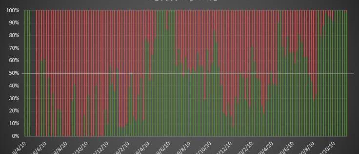 大戶持倉方面,多頭頭寸自2250張進一步下降至1933張,該數值四周連降,空頭頭寸自1803張同步下降至1663張。大戶賬戶連續第三周進行了多空雙向同步減持的倉位調整,雖然行情的上漲勢頭沒有發生明顯變化,但是這類賬戶在最近一段時間里卻一直在進行風控減倉,對于后市進一步上漲的確信度較低。相比于上述兩類機構投資者而言,這類賬戶對于短期市場的判斷并不夠準確。