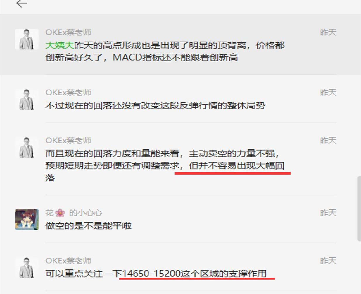不過雖說現在趨勢都保持的完好,但畢竟沒有只漲不跌的商品,而且在成交量和MACD指標上都存在頂背離現象,所以對于沒有成本優勢的場外等待進場的資金來說,多一分謹慎沒壞處,只要你的本金在還愁沒有好的買入機會。建議可以依次關注以下支撐:16100、15800、15400,支撐力度也依次增強,如果出現下跌,當幣價在觸及這些潛在支撐中的任意一個且出現明顯止跌信號