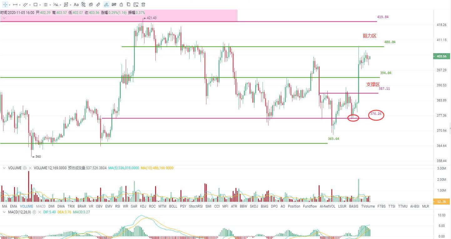 經過昨天這一個強勢的反彈,瞬間扭轉了中、短期的頹勢格局,對后期的走勢可以相對樂觀一些了。短期來看408一線有效上破的概率并不大,所以最好不要去追高買,耐心等回調,支撐可以關注387-394區間,只要觸及該區域且出現比較明顯止跌信號就可以作為買入依據。