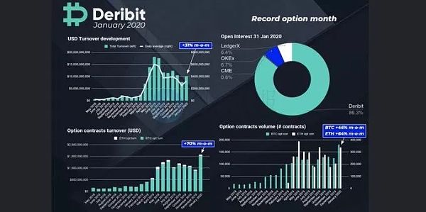 另外,根據Deribit在其推文中發布的一張圖表顯示,2020年1月美元期權交易額環比增長70%,比特幣期權合約交易量創2018年5月以來的歷史新高。并且截至2020年1月31日,在未平倉 (Open Interest) 的期權合約中,Deribit占比高于86%,處于絕對領先的地位,而排在第二位的OKEx占比6.7%,兩家持倉量總和占比達到93%;而在受監管的交易平臺中,LegerX占比6.4%,1月份剛剛上線的芝商所僅占0.6%,而Bakkt并未進入統計之列。
