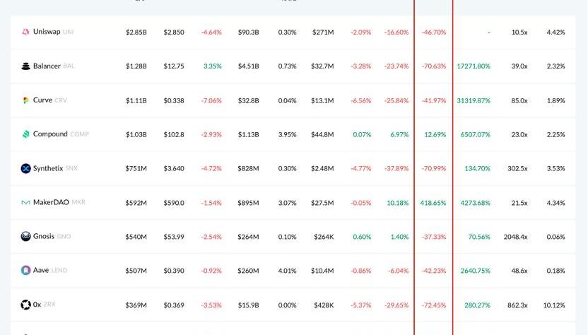 Tokenterminal收錄的數據中,市值排名前十的項目中,30日年化收益率變化指標一項僅有Compound和MakerDAO保持了正值,其余協議均出現了超過35%的下調;7日年化收益率的負值協議同樣多于正值協議。