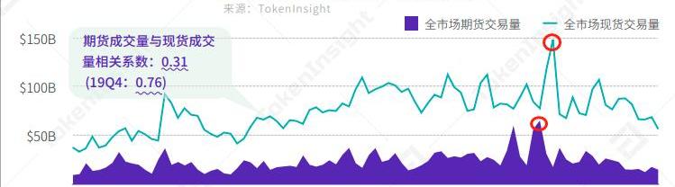 首先,第二輪暴跌是由衍生品市場主導的。根據Tokeninsight數據,2020年3月13日加密資產衍生品市場單日成交量625億美元,遠高于2020年第一季度日均成交量233億美元,并且高于3月12日第一次暴跌的成交量。同時,2020年3月衍生品市場的成交量高峰先于現貨市場;從圖15可以看到該現象在圖中其他時間也有出現,這表明加密資產期貨在本季度具備市場現行指標屬性。
